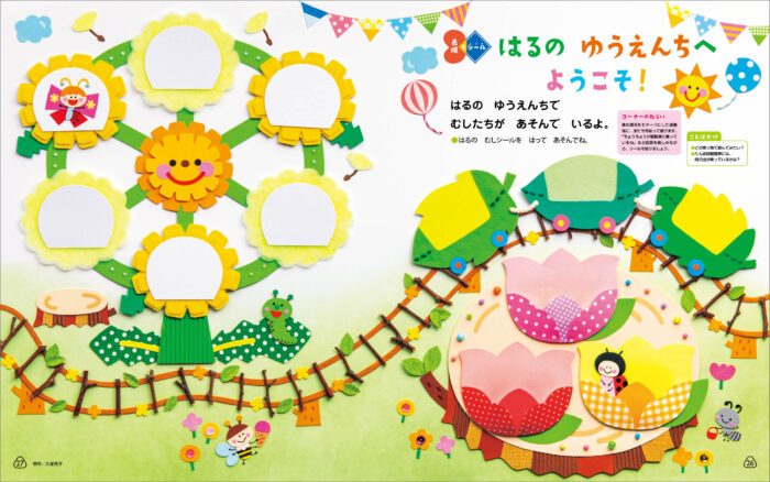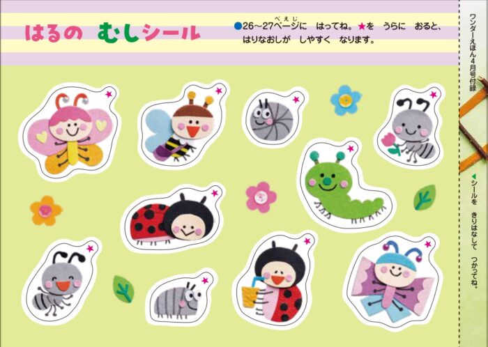 春に見かける虫たちに親しみがもてるよう、シールを手に取り、空中を散歩させたり、ページの好きなところに貼ったりしてみてください。