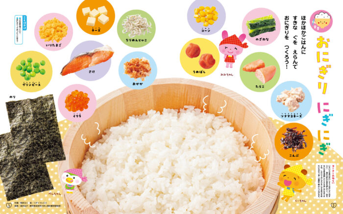 月刊絵本を使い、おにぎりを握る疑似体験をしました。ご家庭でもお子さんに好きな具を尋ね、一緒におにぎりを握ってみてください。