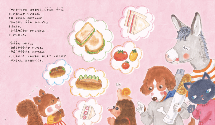 友だちからいろいろなサンドイッチのリクエストがあり、コリンさんはおおあわて! コリンさんはどんなサンドイッチを作るのか想像してみましょう。また、子どもたちが好きなサンドイッチや、ピクニックでどんな遊びをしたいか聞いてみるとお話の世界をより楽しめますね。