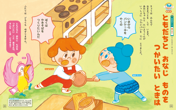 読み始める前に「あれ! たいようくんとあおいちゃんが取り合いをしているね」「どうしたのかな」とささやき、そのあとにタイトルを読むことでいっそう興味がもてるようになります。