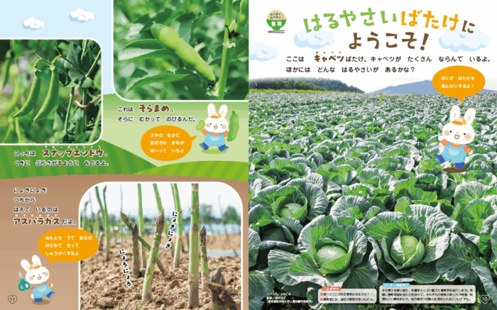 今月は、「はるやさいばたけに ようこそ!」のページがあります。春野菜を食したりお子さんと一緒に料理したりして楽しんでください。
