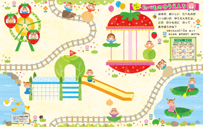 「たべものゆうえんち」の中にある野菜や果物をクラスのみんなで探したり、乗りたい乗り物を伝え合ったりする時間をつくることでシール遊びの会話が弾むようになります。