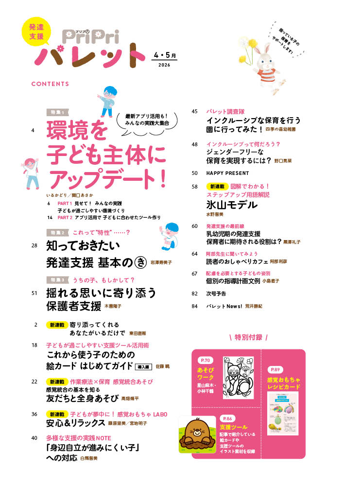 今号は、子どもが過ごしやすい環境づくり実例&最新アプリを活用した支援ツール作りを大特集! 環境の変化や初めてのことが多く、混乱しやすい新年度。園の実践例とアプリ活用を参考に、園の環境をアップデートしませんか? 第2特集では、発達支援の基本を解説。「自閉スペクトラム症(ASD)」「注意欠如・多動症(ADHD)」「学習障害(LD)」「発達性協調運動症(DCD)」の4つの発達障害の主な特性と対応のヒントを紹介します。読み物特集では、わが子の発達に不安や葛藤、悲しみなど、様々な感情を抱える保護者の支援について考えます。