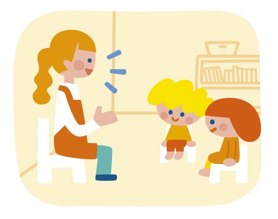 【関わり方】 “静”と“動”のバランスを重視 集まりの前などに体をたっぷり動かす時間を設けると、気持ちを切り替えやすくなります。“静”と“動”の活動を交互にバランスよく取り入れましょう。話をする時は、保育者が余計な装飾のないシンプルな壁を背にして、子どもが壁に向かって聞けるようにすると、話に集中しやすくなります。声かけの際は、目と目を合わせて「手はおひざに置こうね」「3分間も座れたね」など、具体的でわかりやすいことばを選びましょう。