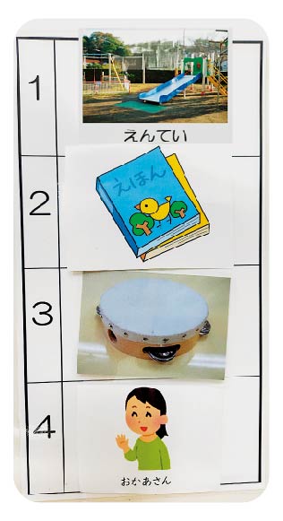 ![]() 活動をルーティン化して見通しをもちやすくする カードやスケジュールボードを活用して、一日の生活の流れをわかりやすく提示。今から何をするのか、いつ終わるのかを、Bさんと一緒に確認するようにしています。見通しがもてると、安心して活動に取り組め、何度も質問をくり返すことが減りました。 低年齢や理解がゆっくりな子には、一日のスケジュールを場面別に分け、各場面に2~4項目ずつ提示。写真は午後、保護者が迎えにくるまでの流れ「園庭→絵本→(タンバリンで)帰りの歌をうたう→お迎えに来る」を確認できるようにしたもの。 |