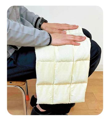 ![]() 重みのあるひざ掛けやクッションで安心感を Bさんの場合、重みを感じられると安心するようでした。そこで、重みのあるひざ掛けを用意し、落ち着かない様子があるときや、手持ち無沙汰になる時間帯などには、ひざにのせたり抱えたりするようにしています。 キルト状に縫い合わせた手作りのひざ掛け。中に小豆を入れて、重みを感じられるようにしました。 |