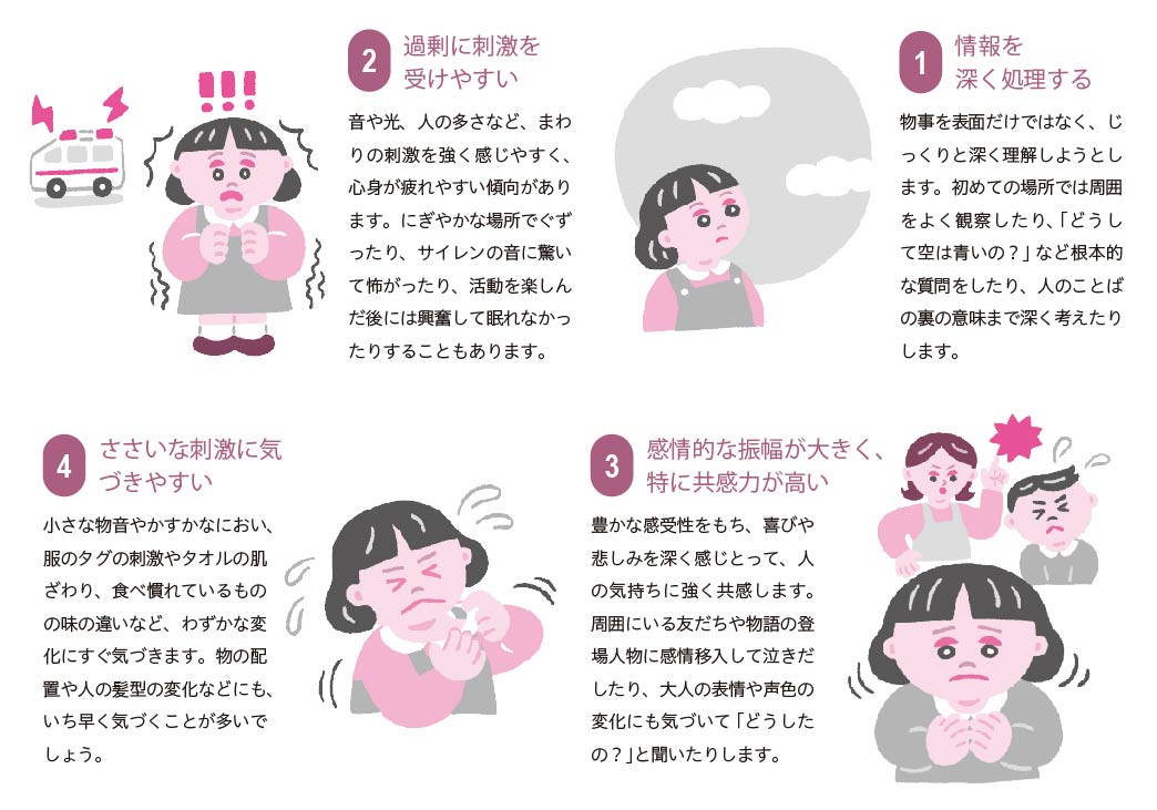 感情や感覚情報処理の「4つの特性」とは? HSCの感情や感覚刺激への反応の特性は、以下の4つにまとめられますが、どの程度当てはまるかは、子ども自身にしかわかりません。そのため、周囲の大人が4つの特性をよく理解し、子どもの反応を見逃さないように、丁寧に見守ることが大切です。
