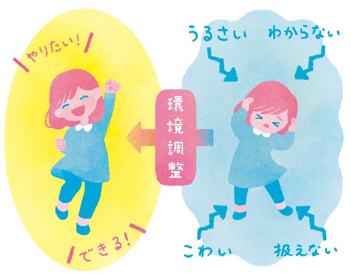 環境には〈物〉〈空間〉〈人〉の3つがあります。子どもの困りごとを軽減し、