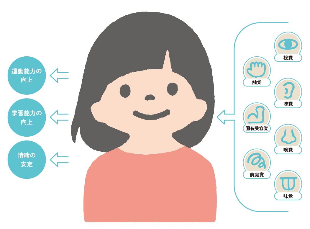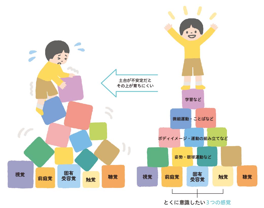 友だちと全身あそび 2026.04.21 「作業療法」と「保育」の視点から、様々な発達を支える感覚統合を育むあそびを紹介します。今号は、感覚統合の基本と、友だちとなかよくなれる全身を使ったあそびです。 感覚統合とは、様々な感覚を脳が整理したりまとめたりする力 近年、感覚統合がうまくいかず、日常生活での動作に困難を感じる子どもが増えているといわれています。 私たちは、「視覚」「聴覚」「嗅覚」「味覚」「触覚」の五感に加え、筋肉や関節の動きを感じる「固有受容覚」、傾きや重力を感じる「前庭覚」などにより、日々、様々な感覚情報を受け取っています。「感覚統合」とは、これらを脳が整理し、適切に反応したり、身体をうまく動かしたりする力のこと。特に幼児期は脳の発達において重要で、感覚統合が促されることで運動・学習能力の向上、情緒の安定などにつながっていきます。 感覚統合は積み木が積み上がるように発達する 前述の7つの感覚のうち、感覚統合の土台となるのは「視覚」「聴覚」「触覚」「固有受容覚」「前庭覚」です。感覚統合は、これらの感覚を土台にして下から積み上がるようにして発達します。たとえば、姿勢を保つには固有受容覚と前庭覚の統合により、身体を持ち上げ、バランスをとる力が必要です。その上に運動や学習の力が育まれていきます。 逆に、土台となる感覚が十分に育っていないと、その上の発達がスムーズにいかず、様々なトラブルが生じることがあります。 ↑画像拡大 \こんな子はいませんか?/ 感覚統合が未熟な子10のタイプ 感覚の調整のトラブル ①ぼんやりしやすい(低反応) ②刺激を欲する(感覚探究) ③刺激を怖がる・不安が強い(感覚過敏) ④刺激に反発する・攻撃的になる(感覚回避) 感覚の識別・フィルターのトラブル ⑤違いに気づきにくい/必要な情報に注意を向けにくい 感覚に起因する姿勢・運動のトラブル ⑥姿勢を保てない ⑦身体の動きがぎこちない ⑧手先が不器用 ⑨両手を使った動作が苦手 ⑩動きを目で追えない 感覚統合の基礎となる 3つの感覚にアプローチ 触覚、固有受容覚、前庭覚は、ほかの感覚と比べて自覚しにくい感覚です。今号ではとくにこの3つに働きかけるあそびを紹介します。 触ったり触られたりすることで感じる ①触覚 皮膚を通して感じる感覚です。温度や痛み、肌触りなどから危険を察知したり、触っている物を識別したりする働きに関わります。抱っこされたときなどの心地よい触覚刺激は、情緒の安定にもつながります。 <こんな働き> ●危険を察知し、身体を守ろうとする ●触ったときの感触の違いなどから物を識別する ●人や物に触れることで情緒を安定させる ●ボディイメージを発達させる(身体の大きさ、長さを把握する)など 身体の位置や動き、力の入れ具合を感じる ②固有受容覚 筋肉や関節で感じる感覚です。身体を動かすときに手足の位置をとらえたり、物を持つ・運ぶ・押すなどの動作において身体に加わる力や重さ、抵抗を感じたりします。力加減や身体・手先の使い方などに関わります。 <こんな働き> ●力を加減し、運動をコントロールする ●ボディイメージを発達させる(身体の動きを把握する) ●重力に逆らって姿勢を保つ(抗重力姿勢) ●筋力の働きを調整してバランスをとる ●力を入れたり、身体を動かしたりして情緒を安定させる など 身体の位置や動き、力の入れ具合を感じる ③前庭覚 筋肉や関節で感じる感覚です。身体を動かすときに手足の位置をとらえたり、物を持つ・運ぶ・押すなどの動作において身体に加わる力や重さ、抵抗を感じたりします。力加減や身体・手先の使い方などに関わります。 <こんな働き> ●力を加減し、運動をコントロールする ●ボディイメージを発達させる(身体の動きを把握する) ●重力に逆らって姿勢を保つ(抗重力姿勢) ●筋力の働きを調整してバランスをとる ●力を入れたり、身体を動かしたりして情緒を安定させる など 教えてくれた人/ 作業療法士 高畑脩平 イラスト/佐藤香苗 支援ツールイラスト/みさきゆい 撮影/中島里小梨(世界文化ホールディングス) 取材・文/オフィス201(中西翔子 船越 唄 和田さや加) お知らせカテゴリー 関連キーワード 春 発達障害発達支援PriPriパレット保育保育雑誌
